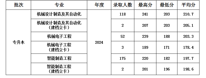 机械工程学院2024年专升本专业录取分数线