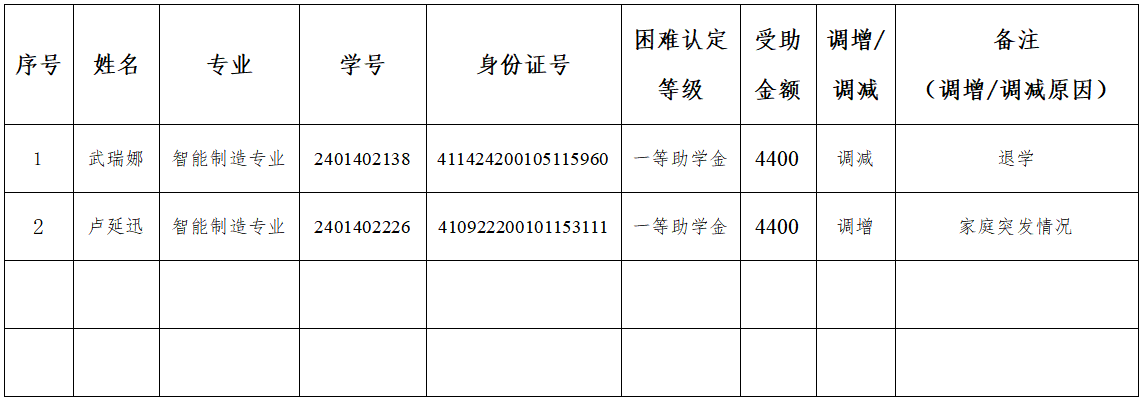 为切实做好我院家庭经济困难学生资助工作,确保国家助学金精准发放,依据学校相关规定,对2025-2026年春季国家助学金进行审核与调整。现将调增调减情况公示如下:
